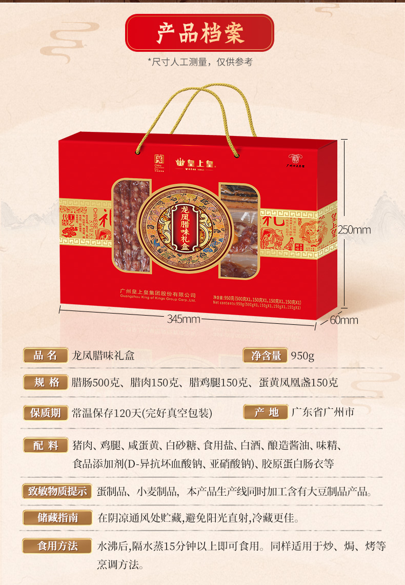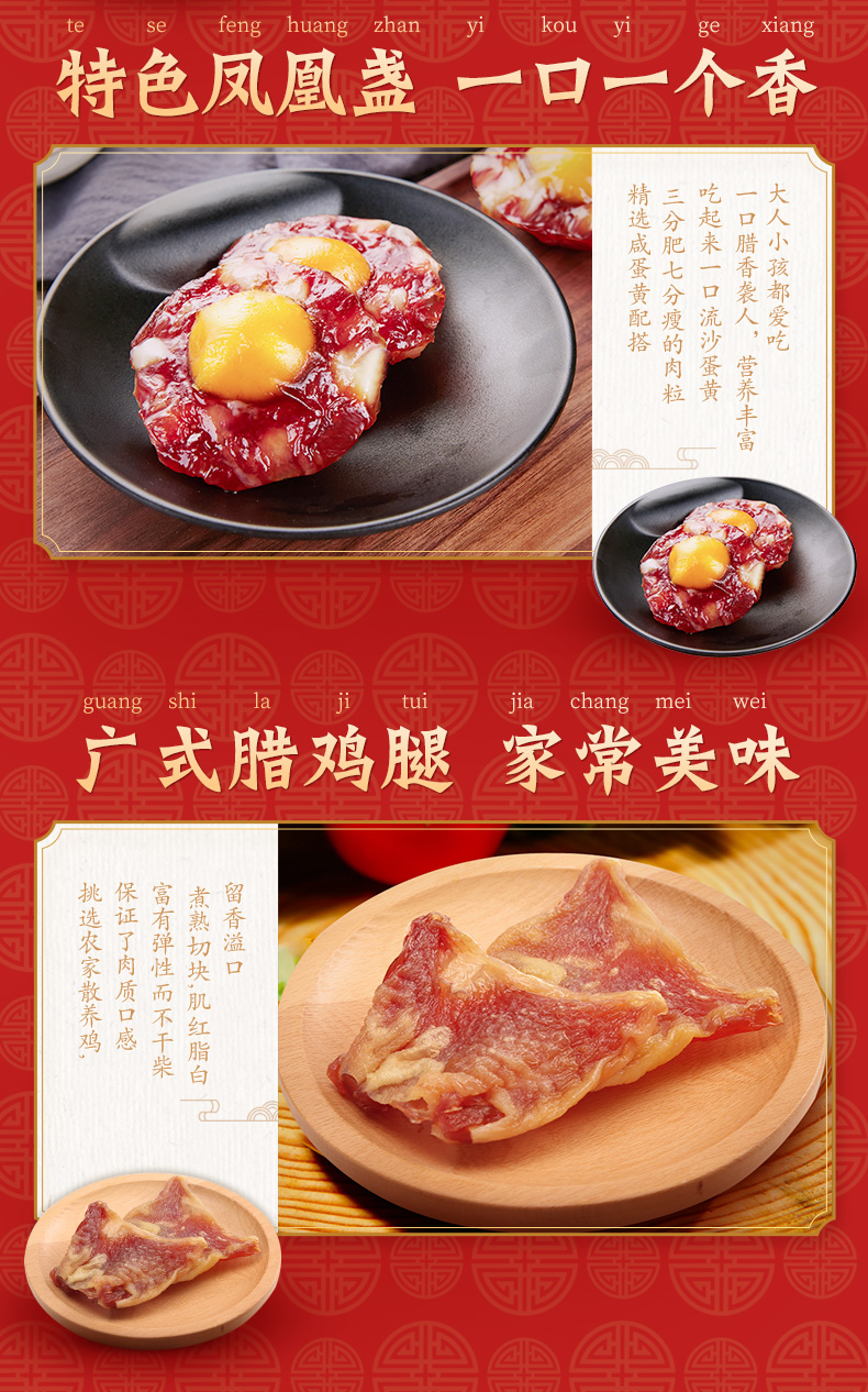 臘腸500克、臘肉150克、臘雞腿150克、蛋黃鳳凰盞150克